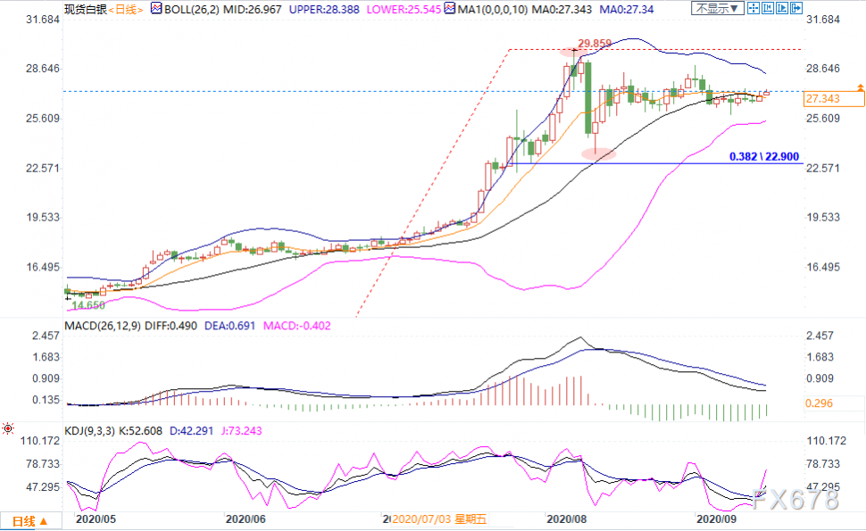 上行方面,先关注9月10日高点27.48,这同时与布林带上轨接近重合;进一步阻力上看28.90-25.85这波跌势的61.8%回撤位27.74。强阻力重点关注9月1日高点28.90;此外,8月18日高点28.47也有一定压制性。