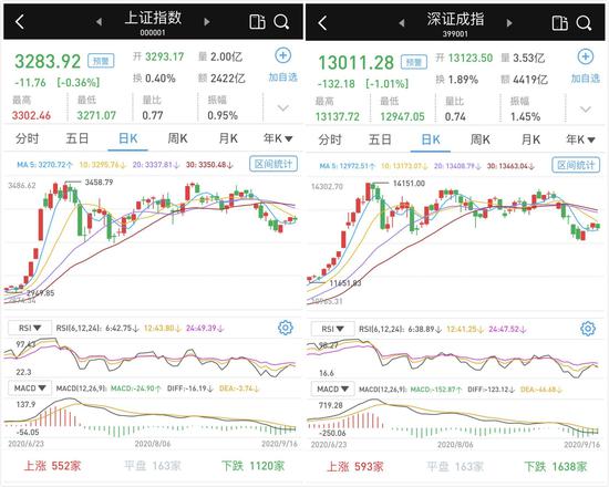 至9月16日收盘,上证综指跌0.36%,报3283.92点;科创50指数跌1.09%,报1349.67点;深证成指跌1.01%,报13011.28点;创业板指跌1.55%,报2554.8点。