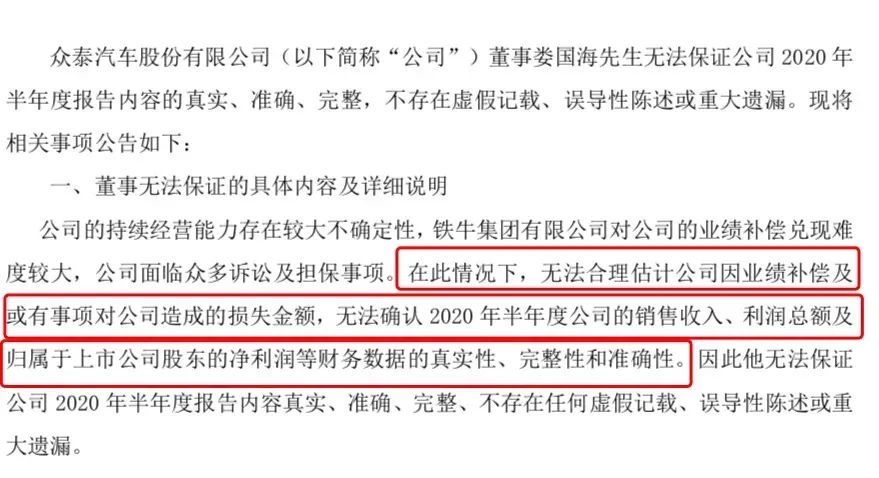 在发布半年报的同时,*ST众泰还发布了《关于董事无法保证2020年半年度报告真实、准确、完整的说明公告》。公告称,董事娄国海先生无法保证公司2020年半年度报告内容的真实、准确、完整,不存在虚假记载、误导性陈述或重大遗漏。