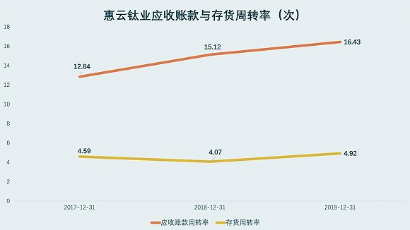 同时,惠云钛业资产的周转效率也在不断改进。2017年到2019年,公司应收账款周转率分别为12.84、15.12和16.46,存货周转率分别为4.59、4.07和4.92。