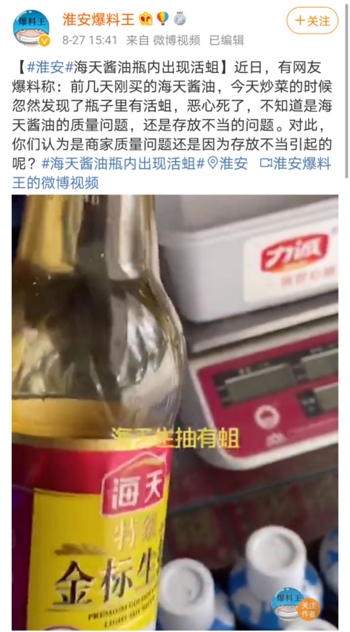 网友称在海天生抽瓶内发现蛆虫来源:淮安爆料王微博