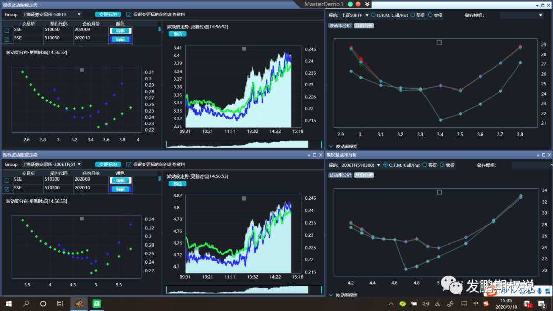隐波日内走势与波动率曲线单日变动见咏春大师图,左侧两图蓝色、红色、绿色分别为10/12月期权隐波,背景为标的走势,上为50ETF期权、下为300ETF期权;右侧两图为当月波动率曲线图,彩色曲线为今日,淡蓝色为昨日,上为50ETF期权、下为300ETF期权。