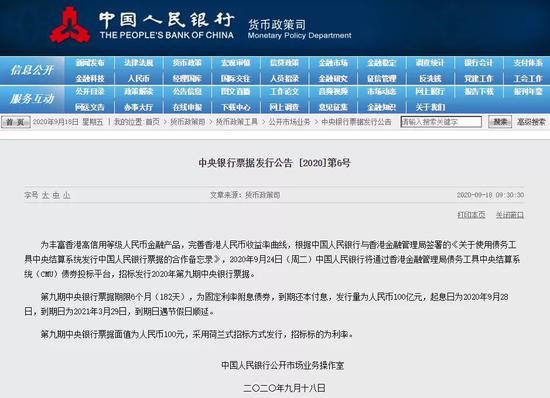 据悉,第九期中央银行票据期限6个月(182天),为固定利率附息债券,到期还本付息,发行量为人民币100亿元,起息日为2020年9月28日,到期日为2021年3月29日,到期日遇节假日顺延。