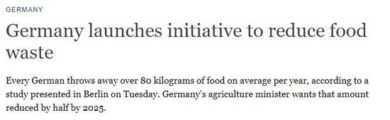 2019年,德国联邦政府出台《减少食品浪费国家战略》 (The National Strategy for Reducing Food Waste),呼吁民众提高节约意识,从根本上解决食品浪费问题。