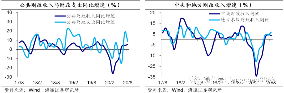 8月全国一般公共预算收入12043亿元,同比增速继续回升至5.3%,创19年11月以来增速新高,其中中央(3.5%)收入增速略有回落,地方(6.9%)收入增速有所上行。财政收入增速回升主因经济持续复苏。