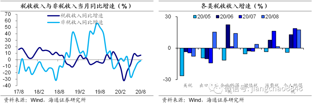 8月税收收入9727亿元,同比增速由7月的5.7%升至7%,非税收入2316亿元,同比增速-1.4 %,较7月增速-5.8%降幅有所收窄。