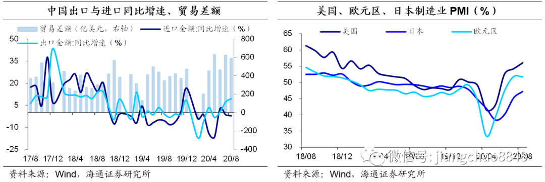 8月我国以美元计价出口同比继续回升至9.5%(前值7.2%),8月贸易顺差589.3亿美元。8月主要国家的经济活动继续恢复,美国、日本制造业PMI持续回升,欧元区线上保持平稳,外需景气度向好。而19年同期基数偏低,对出口增速回升亦有贡献。