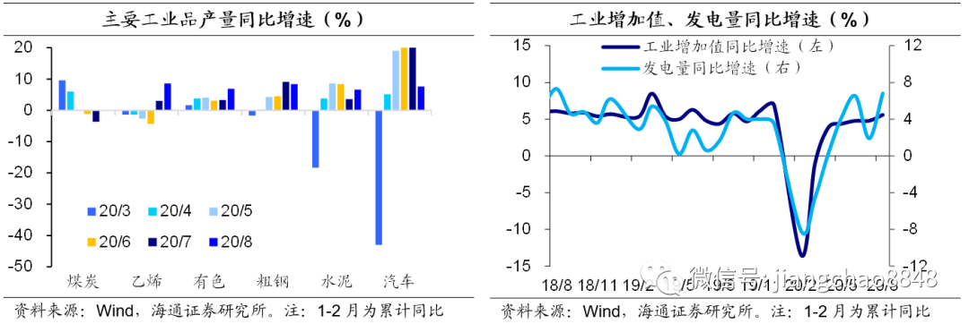 微观层面:发电量增速大幅反弹,主要工业品产量增速涨多跌少。从微观看:一方面,前期气候因素影响逐渐消退,8月份发电量增速大幅反弹,走势与工业增加值增速保持一致;另一方面,各主要工业品产量增速涨多跌少,煤炭、乙烯、有色和水泥增速均现回升,而钢铁、汽车增速回落,化纤增速走稳。整体来看,与基建和地产投资相关度较高的工业品产量增速多数回升,是主要贡献。