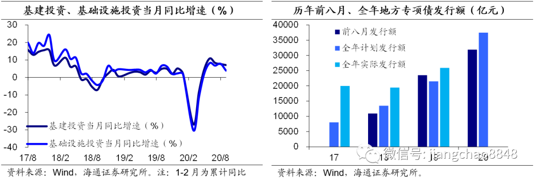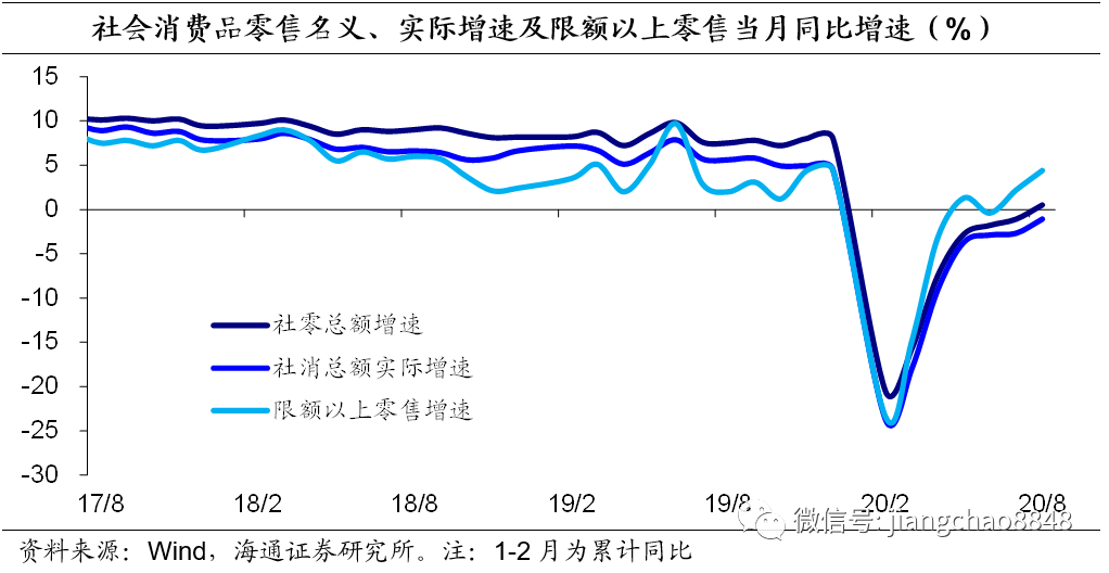 生产显著回升。8月工业增速明显回升至5.6%,指向工业生产有所改善。8月固定资产投资当月增速继续上行至9.3%,其中民间投资增速显著回升至19.5%,指向投资的内生动力恢复势头较强。8月三大类投资增速涨多跌少,其中制造业投资增速由负转正至5%,而基建投资增速小幅回落,估算新、旧口径下的基建投资当月增速分别为4%、7.1%,去年同期基数抬升以及专项债资金落地时滞均制约了基建投资增速走高。8月房地产投资当月增速继续上升至12.1%,创19年5月以来新高。虽然8月份土地购置面积和新开工面积增速双双回落,但房企到位资金的改善以及竣工增速低位徘徊仍对地产投资形成支撑。8月社消零售、限额以上零售增速分别升至0.5%、4.4%,其中社消零售增速年内首次实现正增长,消费的恢复速度短期有明显加快。信用扩张带动经济自疫情后较快修复,8月主要经济指标均有改善。根据社融增速对经济的领先性,我们预计本轮经济复苏有望延续到明年上半年。