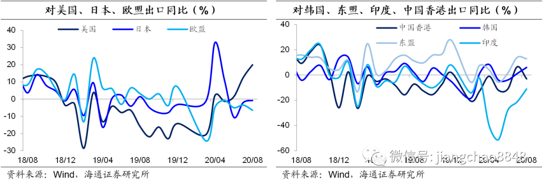 从国别和地区来看,8月对发达经济体出口涨跌互现,对美国(20%)出口明显回升,对日本(-0.8%)出口同比降幅继续收窄,对欧盟(-6.5%)则有所回落;对新兴经济体出口也出现分化,对韩国(6%)和印度(-11.1%)出口增速均继续改善,但对东盟(12.9%)出口有所回落,对中国香港(-3%)出口增速则重新转负。