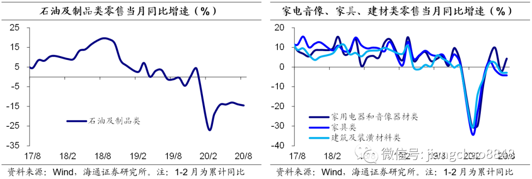 可选消费涨跌互现。8月份汽车类零售增速略有回落,但仍处年内次高点,石油及制品类零售增速降幅继续扩大,地产相关的家具类、建材类零售增速降幅扩大,但家电类增速由负转正,通讯器材类、金银珠宝类零售增速也有明显反弹。