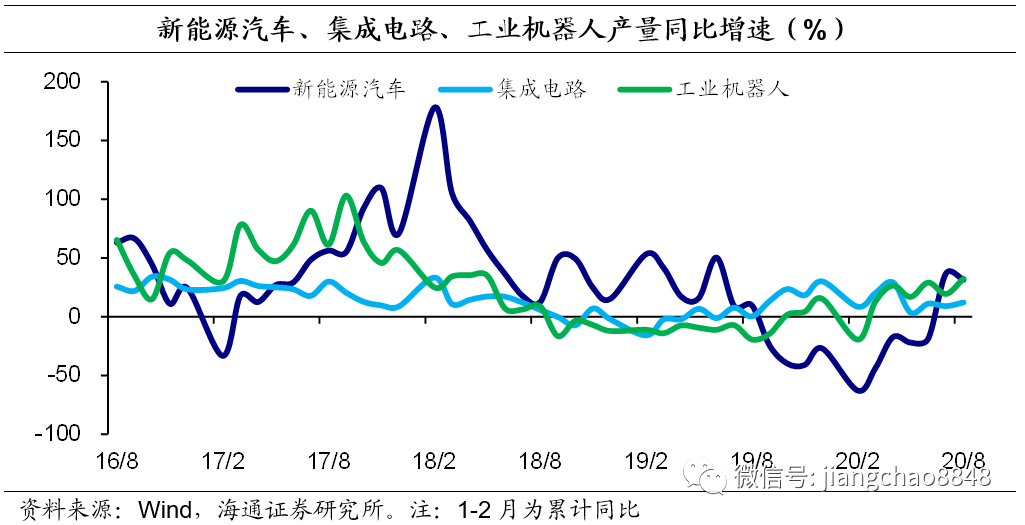 新产品增长较快。8月高技术制造业同比增速7.6%,明显快于规模以上工业整体增速。新产品方面,8月集成电路和工业机器人产量增速分别回升至12.1%和32.5%,新能源汽车产量增速略降至31.6%,仍处于较高的增长水平。