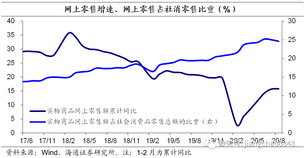 实物商品网上零售增速稳定。1-8月份实物商品网上零售增速保持稳定在15.8%,远高于社消零售整体增速,占社消零售的比重达24.6%。