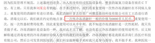 而何某兵在供述中提到,“重复使用的消融针有进行消毒,我把消融针拿去给原广州雅敦公司员工王某进行消毒,消毒完以后,我们就在约定的地点拿。一次性冷冻消融针一根的价格为9000多人民币,重复使用一次,按一次性器材费用收费,因此重复使用可以从中牟利。”