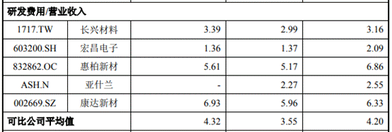 公司研发费用率始终低于同行公司均值。2017年至2019年,上纬新材研发费用分别为2242.54万元、2588.65万元、2543.93万元,研发费用率分别为2.19%、2.09%和1.89%。同行业可比公司研发费用率平均值分别为4.20%、3.55%、4.32%。
