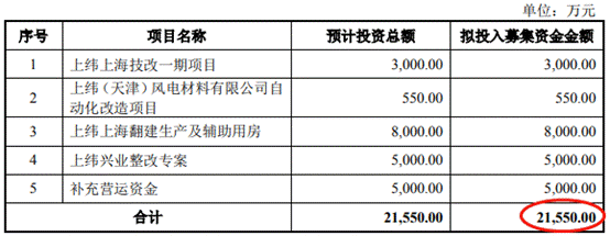 上纬新材原拟募集资金净额为2.16亿元,分别用于上纬上海技改一期项目、上纬(天津)风电材料有限公司自动化改造项目、上纬上海翻建生产及辅助用房、上纬兴业整改专案、补充营运资金。公司实际募集资金仅为原拟募集资金的32.50%。