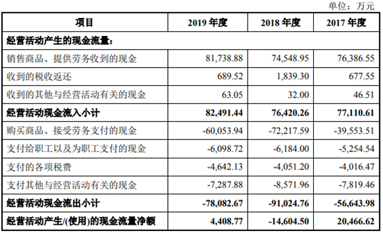 业绩方面,上纬新材现金流表现落后。连续3年销售商品、提供劳务收到的现金无法覆盖营业收入,经营净现金流2018年为负,2019年也远低于净利。