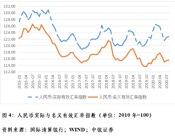 国际清算银行的数据也显示,今年以来,人民币名义和实际有效汇率指数分别最多升值了2.9%和3.4%,但年初到8月份,升幅分别为1.0%和0.4%(见图4)。主要原因是,3月底以来,全球股市反弹、市场恐慌消退、美元指数回落,所有非美货币对美元都开始升值。4、5月份,其他非美货币对美元升得快些,人民币还在低位震荡。6月份以后,人民币加速升值,一定程度上有补涨的性质。故从较长时期看,人民币汇率指数涨幅有限,对我国出口竞争力的总体影响可控。