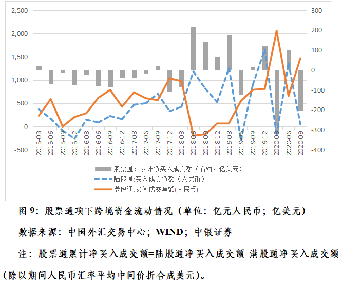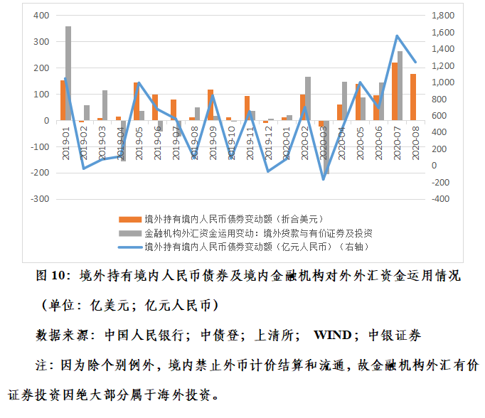 其实,我们稍加留意就可以找到资本外流的佐证。例如,市场通常只关注陆股通北上资金的进出,而忽视了港股通南下资金也在同时发生。今年前三季度(截至9月18日),陆股通项下累计净买入成交额1225亿元人民币,同比减少34%;港股通项下累计净买入成交额4180亿元人民币,增长197%;股票通项下净流出资金约合426亿美元,去年同期为净流入68亿美元(见图9)。再如,根据中债登和上清所数据,今年前8个月,境外净增持境内人民币债券5503亿元人民币,同比增长58%,约合784亿美元。而根据央行统计数据,今年前7个月,境内金融机构外汇资金运用中,净增加境外贷款和有价证券及投资合计626亿美元,同比增长101%(见图10)。