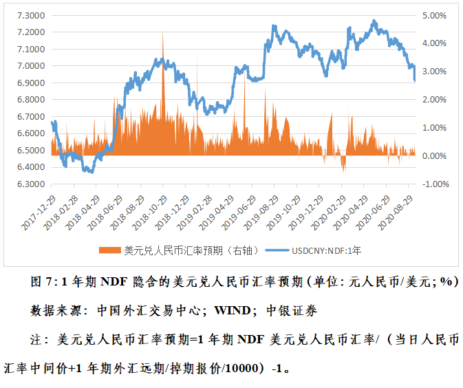 首先,人民币汇率升得快并不意味着有升值预期。从1年期无本金交割远期交易(NDF)隐含的美元兑人民币汇率预期看,9月1日至18日,仅有1日和16日分别出现了0.16%和0.13%的贬值预期,其他12个交易日均为升值预期,日平均为升值预期0.15%,甚至还略高于8月份的日均升值预期0.09%。其原理是,因为人民币汇率弹性增加、升值较快,及时释放了升值压力,避免了预期积累。2018年人民币汇率宽幅震荡也是一个非常典型的例子。4月2日,人民币汇率中间价创下年内新高,较上年底升值了4.1%。然后,在国内经济下行、美元指数反弹、中美经贸摩擦等因素综合作用下,震荡下跌至8月3日的6.8322(当晚央行宣布恢复对远期购汇征收20%的外汇风险准备),4个月累计跌了8.1%。但同期美元兑人民币汇率贬值预期平均只有0.84%(见图7),远低于2015和2016年动辄4%~5%的水平。