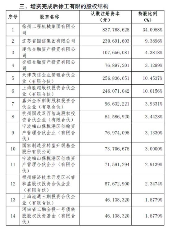 值得一提的是,员工持股平台——徐州徐工金帆引领企业管理咨询合伙企业(有限合伙)向徐工有限投资8.7亿元,持股比例约为2.7%。