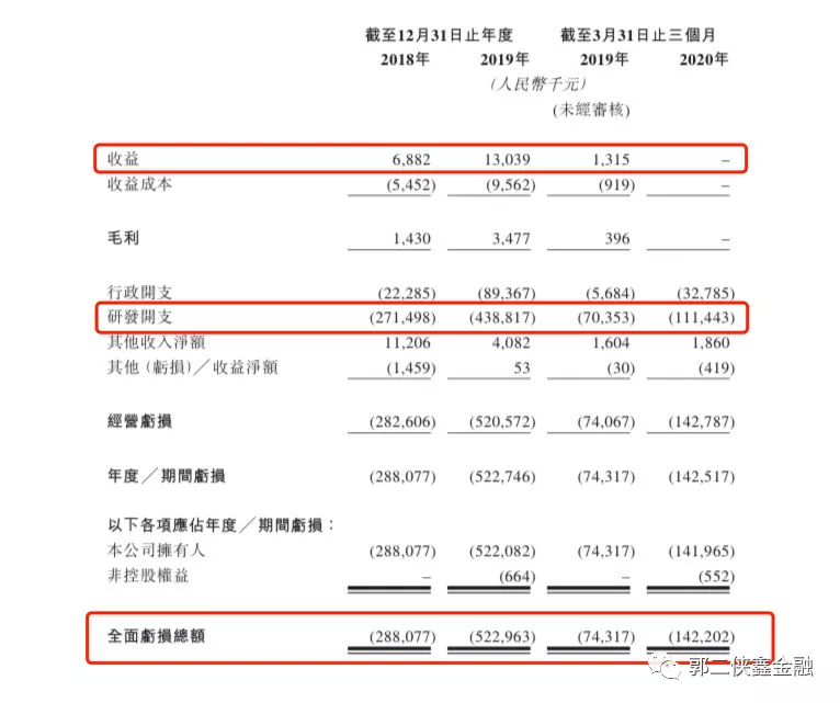 财务数据显示,2018、2019年,2020年一季度,公司收入分别为688.2万元、1303.9万元、0元,净利为亏损2.9亿元、5.2亿元、1.42亿元;同期研发开支分别为2.7亿元、4.4亿元、1.1亿元。目前公司无新药商业化销售额,报告期营收来自于向其他生物医药公司提供研发、制造服务产生的收入。