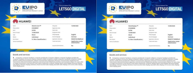 今年8月,部分微博数码博主曝光两张截图,图片显示华为向欧盟知识产权局申请获得了两个商标,分别是“MateDisplay”和“MateScreen”。