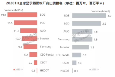 上述报告称,2020年,中国大陆面板厂供应规模持续增长,上半年出货占比达到37%,超越台湾面板厂占据主导地位,主要原因是大陆厂商绝对的高世代线产能优势。
