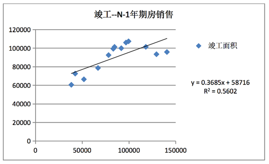 由当年竣工面积与N-1年期房销售面积线性拟合如下,