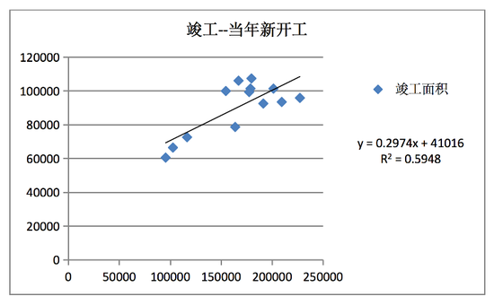 把当年竣工面积与N-1年新开工面积线性拟合如下,