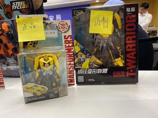 如果不是有警察事先贴好的‘正品’和‘仿品’纸条,估计大多数人第一眼都分辨不出仿制变形金刚和正版之间的区别。