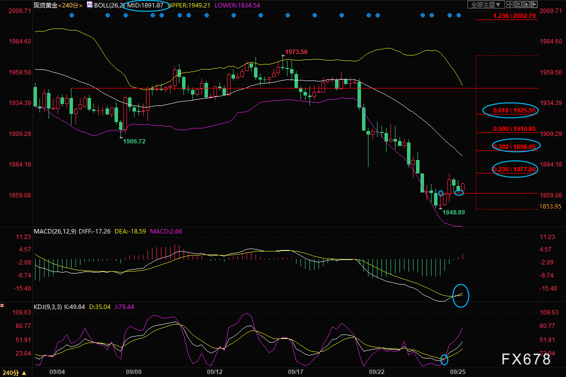 单边下跌后温和反弹;K线在相对低位录得启明星底部信号,MACD低位金叉,KDJ金叉,金价短线存在见底的机会;目前正视图1973-1849跌势的23.6回撤位1877.80附近阻力,布林线中轨阻力在1891.84附近,若能顶顶破该阻力,则增加短线看涨信号;38.2%回撤位1896.05位置也可以简单予以留意。但需要顶破61.8%回撤位1925.55附近阻力,才能扭转中线看空信号。
