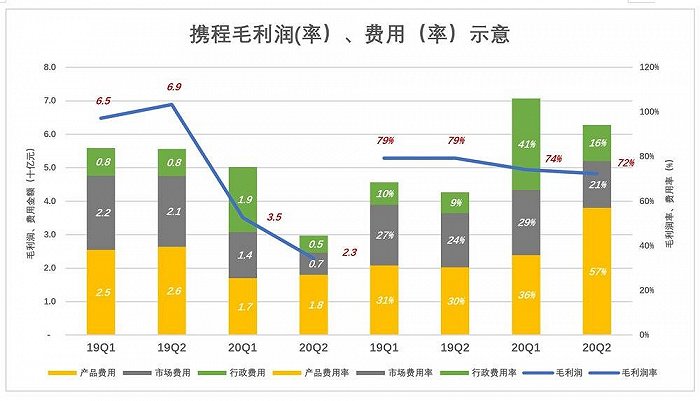 用蓝色折线代表毛利润(率)、彩色堆叠柱代表费用(率)。除非天灾人祸,绩优股携程的蓝色总是能“淹没”彩色。比如2019年Q2,毛利润为69亿,产品、市场、行政费用分别为17亿、14亿、19亿,费用合计为56亿;毛利润率为79%、各项费用率合计为63%。
