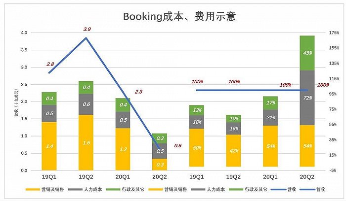 2020年Q2,Booking营收进一步跌到6.3亿美元;人力成本基本无法压降,营销及销售费用被砍掉四分之三,行政费用砍掉二分之一;成本、费用合计11亿美元,相当于营收的171%(携程的这个比例是94%)。