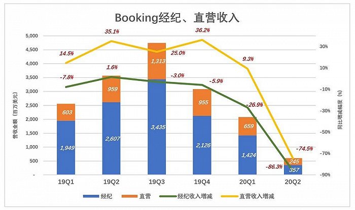 到了二季度,Booking终于绷不住了,经纪、直营收入分别断崖式下跌74.5%、86.3%。