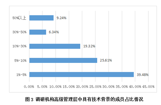调研结论二:大部分调研机构金融科技人才短缺问题突出,管理层中技术背景人员占比和全体员工中专业技术人员占比普遍较低。