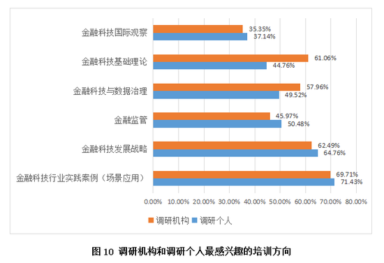 调研结论五:调研机构和调研个人在培训内容上具有一致偏好,希望得到金融科技行业实践案例(场景应用)方面的培训,最感兴趣的前沿技术分别是人工智能、大数据、云计算、区块链。