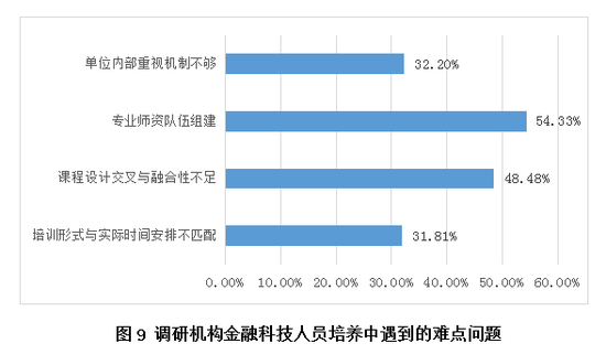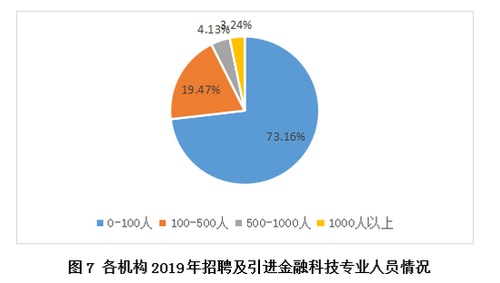 调研结论四:七成调研机构2019年招聘及引进金融科技人员的数量在100人以下,机构招聘及培养金融科技人员过程中存在人才实践应用能力不足、专业师资队伍组建等诸多难点问题。