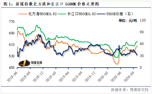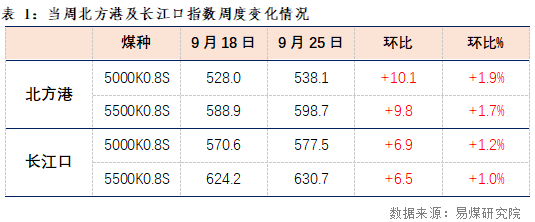 上周周港口市场货源紧张,呈现逐步上涨态势。周度指数(9月21日-9月25日)方面:易煤北方港动力煤价格指数(YBSPI)5000K0.8S为538.1元/吨,环比上期上涨10.1元/吨,涨幅1.9%,5500K0.8S指数为598.7元/吨,环比上期上涨9.8元/吨,涨幅1.7%。易煤长江口动力煤平仓价格指数(YRSPI)5000K0.8S当期指数为577.5元/吨,环比上期上涨6.9元/吨,涨幅1.2%,5500K0.8S当期指数为630.7元/吨,环比上期上涨6.5元/吨,涨幅1.0%。