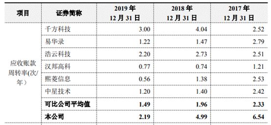 招股书表示,与同行业其他公司比较,公司应收账款周转率整体较高,应收账款回收情况良好,回款率较高,且行业平均值从2017年到2019年呈现下降趋势,公司应收账款周转率的变化符合整体行业趋势。报告期公司处于快速发展期,营业收入快速增长,相应的应收款项也快速增长,随着公司业内知名度的提升,承接大项目的能力得到了加强,大金额合同项目执行周期普遍较长,其客户主要为政府部门、非政府事业单位或者国有企业,其验收、结算过程较为严格,付款周期较长,导致了公司应收账款周转率的降低。