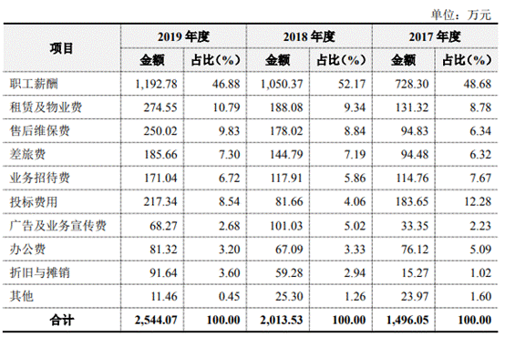 招股书称,报告期内公司销售费用率整体处于同行业可比公司的销售费用率区间内,不存在明显差异。但分年度来看,公司销售费用率与同行业可比公司相比各有高低,具体原因如下:2017年,公司经营规模和营业收入规模相对较小,但公司为了推进全国业务布局,提前招聘了并储备了部分外地销售人员,新增租赁了部分经营场所,导致销售人员薪酬、租赁及物业费较高,销售费用率略高于同行业可比公司。