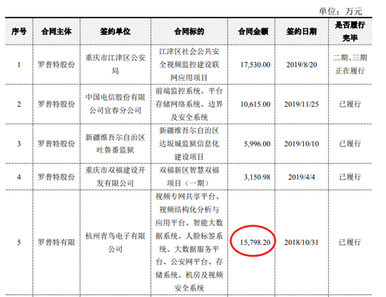 罗普特与杭州青鸟的合同金额为1.58亿元,签约日期为2018年10月31日,已履行完毕。