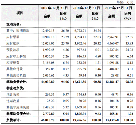 招股书称,报告期,公司业务规模的迅速扩大,推动了公司应付票据及应付账款规模的随之扩大,是导致公司负债总额快速增长的主要原因。同时,随着公司业务规模的扩大,公司通过短期借款补充公司日常经营的流动资金,也是导致公司负债总额增长的主要因素之一。