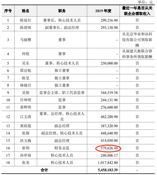 崔利2019年2月入职后,当年即从罗普特领取薪酬57.96万元,这一薪酬高于董事长、核心技术人员陈延行的薪酬额29.92万元,仅低于核心技术人员张龙101.78万元的薪酬。
