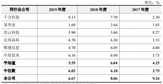 2019年,公司销售费用率低于同行业可比公司销售费用率平均值,一方面是由于公司2019年营业收入继续快速增长,营业收入增长率高达39.21%,高于销售费用增长幅度,导致公司2019年销售费用率进一步下降;另一方面是由于同行业可比公司中熙菱信息(300588)在2019年因经营策略调整,营业收入有所波动,当年销售费用率较为异常,其销售费用率从2018年的5.46%提升至2019年的13.25%,明显拉高了同行业可比公司的销售费用率平均值。