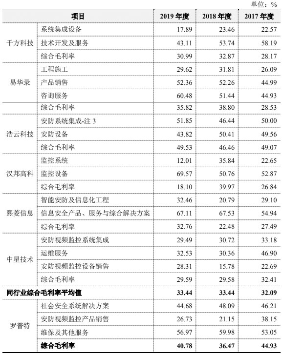 报告期内,罗普特毛利率整体呈下行趋势,但同行整体上行,且各期罗普特毛利率始终超同行均值。2017年-2019年,罗普特综合毛利率分别为44.93%、36.47%、40.78%,同行业综合毛利率平均值分别为32.09%、33.44%、33.44%。