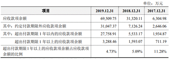 2017年-2019年,罗普特应收款项余额分别为0.63亿元、3.13亿元、6.95亿元,其中约定付款期限外应收款项余额分别为2646.06万元、7126.24万元、3.10亿元。
