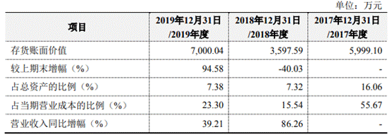 公司存货账面价值2019年末较2018年末增加3402.44万元,增幅94.58%,主要原因系公司经营规模扩大所致。