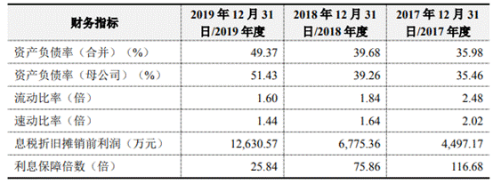 各期,公司资产负债率(合并)分别为35.98%、39.68%、49.37%,流动比率分别为2.48、1.84、1.60,速动比率分别为2.02、1.64、1.44。