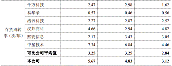 各期,公司存货周转率分别为3.12、4.83、5.67,可比公司平均值分别为2.84、3.25、3.25。